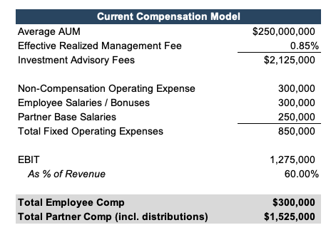 Consider an RIA with two owners and two employees. The two employees know that the firm manages $250 million and estimate that the firm’s effective fees are 85 basis points, so they calculate that the firm likely generates $2,125,000 in annual revenue. By estimating overhead expenses and subtracting their own salaries, they surmise that the two owners/employees take home around $1.5 million, in aggregate.