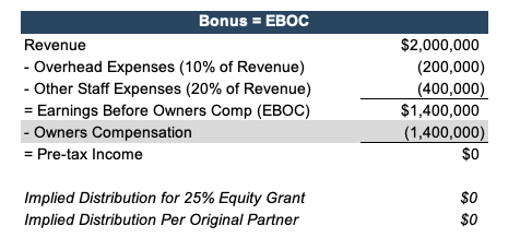 Take the example below of an RIA with four partners with equal ownership considering a 25% equity grant to bring on a new partner who will help the company expand its reach. To minimize their tax burden, the owners historically have not paid themselves a salary and instead were compensated through distributions. However, if they bring on a new employee with a salary and 25% ownership, the new partner would receive higher compensation (including distributions) than the original partners who aren’t taking any salary or bonus.