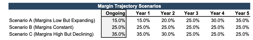 A high margin conveys that a firm is doing something right. But what really matters from a buyer’s perspective is not what the margin is now, but what it will be in the future. Consider the three scenarios below. In Scenario A, the EBITDA margin starts relatively low (15%), but improves over time. In Scenario B, the margin starts at a higher level (25%) but remains constant. In Scenario C, the margin starts at 35% but declines over time.