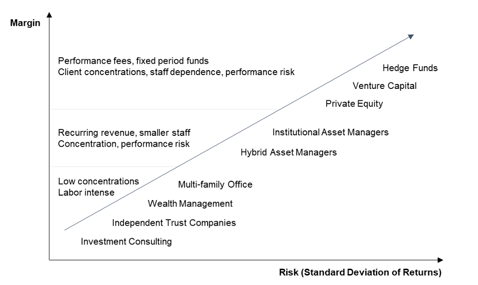 At the lower end of the spectrum are more labor-intensive disciplines like wealth management and independent trust companies. For these businesses, bringing on additional clients translates directly into increased workload for staff, which will ultimately translate into higher staffing levels and compensation expense as the business grows. While margins are lower, the risk is less. Key-person risk is less because an individual’s impact is generally limited to the clients they manage, and not the entire firm’s investment strategy. Client concentration is less because wealth management firms tend to have a large number of HNW clients rather than a few large institutional clients. Performance risk is generally less of a concern as well.