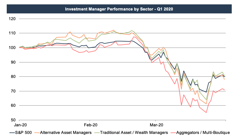 The chart below shows there was nowhere to hide last quarter, as all four components of the RIA industry dipped into bear market territory. The primary driver behind the decline was the decline in the market itself, as most of these businesses are primarily invested in equities, and the S&P was down 20% over the quarter. The aggregators are down a bit more since their models rely on debt financing, which exacerbates losses during times of financial strain.