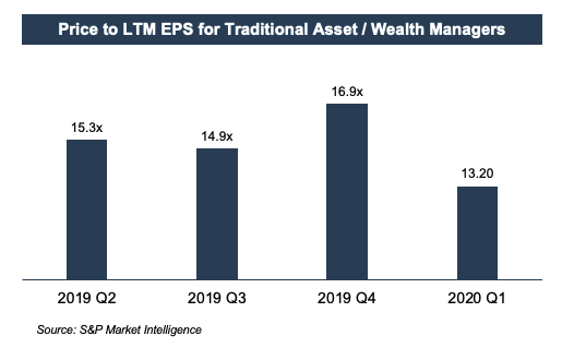 One is the overall market for RIA stocks, which is down 20% in the first quarter (see chart above). The P/E multiple is another reference point, which has declined 22% so far this year. We apply this multiple to a subject RIA’s earnings, so we also have to assess how much that company’s annual AUM, revenue, and cash flow have diminished over the quarter while being careful not to count bad news twice.
