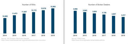 Despite consolidation pressures and record levels of acquisition activity, the reality is that the number of RIAs continues to increase, with formations outpacing consolidation. In 2019, there were approximately 13,000 individual SEC registered investment advisory firms, up from about 10,900 in 2014.