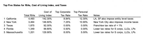 Texas and Florida have been climbing the rankings of states with the most RIAs, but two states still dominate this survey – New York and California. New York’s position is even stronger if you include adjacent communities of investment management firms in Connecticut, New Jersey, and Pennsylvania.