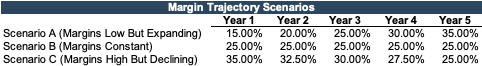 A high margin conveys that a firm is doing something right. But what really matters from a buyer’s perspective is not what the margin is now, but what it will sustainably be in the future. Consider the three scenarios below. In Scenario A, the EBITDA margin starts relatively low (15%), but improves over time. In Scenario B, the margin starts at a higher level (25%) but remains constant. In Scenario C, the margin starts at 35% but declines over time.