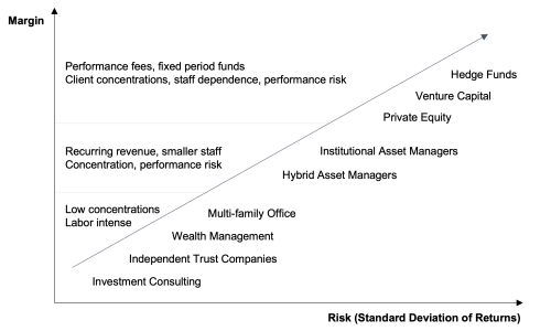At one end of the spectrum are hedge funds, venture capital firms, and private equity managers. The high fees these companies generate per dollar invested can support very high margins, but the risks of client concentrations, underperformance, and key staff dependence are significant. Traditional institutional asset managers are somewhere in the middle of the spectrum. When these companies get it right, institutional money can pour in rapidly. A successful institutional asset manager may find themselves managing billions more in assets while staffing remains virtually unchanged. The additional fees flow straight to the bottom line, and margins can be robust as a result. But the risks are significant. Institutional money can leave just as quickly as it came if the manager’s asset class falls out of favor or if performance suffers. At the lower end of the margin spectrum are more labor-intensive disciplines like wealth management and independent trust companies. For these businesses, bringing on additional clients translates directly into increased workload for staff, which will ultimately translate into higher staffing levels and compensation expense as the business grows. While margins are lower, the risk is less. Key person risk is also less, because an individual’s impact is generally limited to the clients they manage, and not the entire firm’s investment strategy. Client concentration is less of a problem, because wealth management firms tend to have a large number of HNW clients rather than a few large institutional clients. Performance risk is generally less of a concern as well.