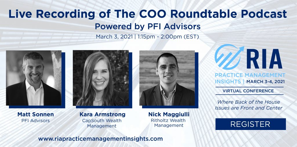 Early in the COVID pandemic, PFI Advisors published an article outlining how RIAs could perform an “Operational Diagnostic” to improve their profitability.  Matt Sonnen wrote, “For now, advisors are focusing on exactly what they should be doing – guiding their clients through this turmoil and keeping them calm and focused on their long-term financial goals.  When the time is right, however, I’ll forward this article to our clients so they can begin the work of focusing on the bottom line…”Nine months later, most RIAs and their clients have recovered from the market volatility and ended up having a very good year, at least on paper.  Now’s the time for RIA principals to consider how they can advance their firms to be ready to meet the next challenge with greater ease.We’re featuring Matt Sonnen’s wisdom on operational best practices and business strategy in our upcoming conference, RIA Practice Management Insights, on March 3 and 4.  Registration is open.