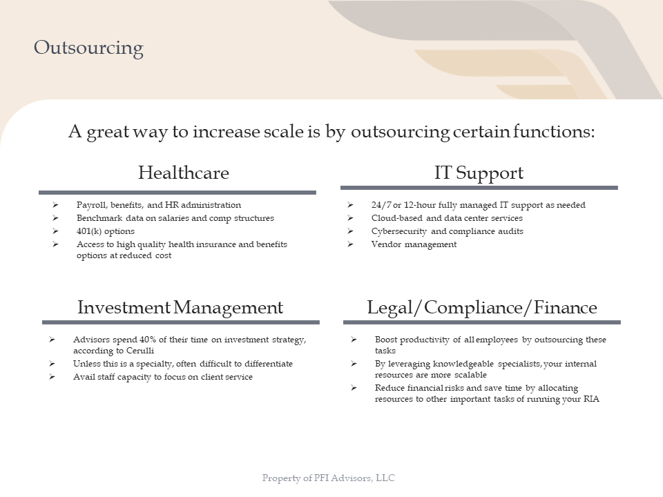 One last area worth evaluating is what services are you outsourcing vs. conducting in-house?  We recently wrote an article expressing our thoughts around building vs. buying your RIA’s client portal.  Other areas you may want to consider outsourcing are: