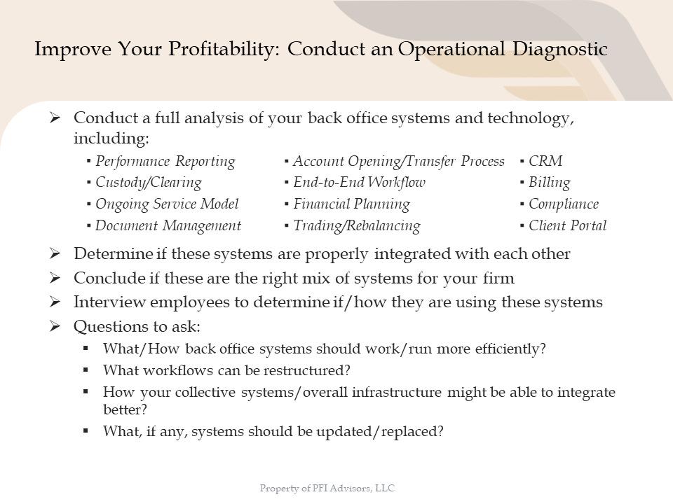 The next big question is, “What the heck are we going to do about it?” There are only two sides to the profitability equation that you can manipulate in order to boost profitability: you can increase revenue, or you can decrease expenses.  Given the fact that no one knows how the current economic uncertainty is going to play out and the effect it will have on RIA revenue, it is most logical to focus on expenses.  There are hard costs to examine – “Where can we spend less money?” and there are productivity costs to review – “Where are we under allocating resources that we could be more productive and service our clients more efficiently?” In our opinion, the best way to perform this analysis is through an Operational Diagnostic, where you review each of your core back office systems and workflows and ask yourself a few key questions, detailed below.  Maybe you are spending money on systems that your firm is not fully utilizing, and there is a less expensive system that could be implemented without causing any decrease in client service.  Maybe you have underspent in certain areas, which is causing too many man hours to be spent on basic tasks.  The Operational Diagnostic process should reveal these areas and allow you to more efficiently provide high-touch service to your clients.