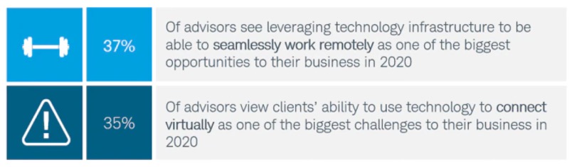 Despite steady gains over the last year, wealth management firms still face challenges pertaining to fee pressure, succession planning and connecting with millennials who are more interested in robo-advisors and fintech products than being counseled by their parents’ advisor. Additionally, the switch from in-person meetings to digital communication is viewed by many as another obstacle. According to a recent Schwab study, 35% of advisors viewed clients’ ability to connect virtually as one of the biggest challenges to their business in 2020. On the flip side, 37% of advisors view leveraging technology infrastructure to be able to seamlessly work remotely as one of the biggest opportunities to their business.