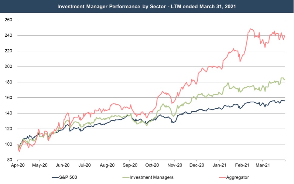 Nearly all sectors of the stock market are up over the last year, but that’s especially true for the RIA industry. Even if most wealth management firms don’t employ any debt in their capital structure, their performance is very much levered to the stock market due to its direct effect on AUM balances, and the operating leverage inherent in the wealth management model. RIA aggregators are even more levered to market conditions, since they typically borrow money to purchase wealth management firms. It shouldn’t be too surprising that our aggregator index is up 140% over the last year.