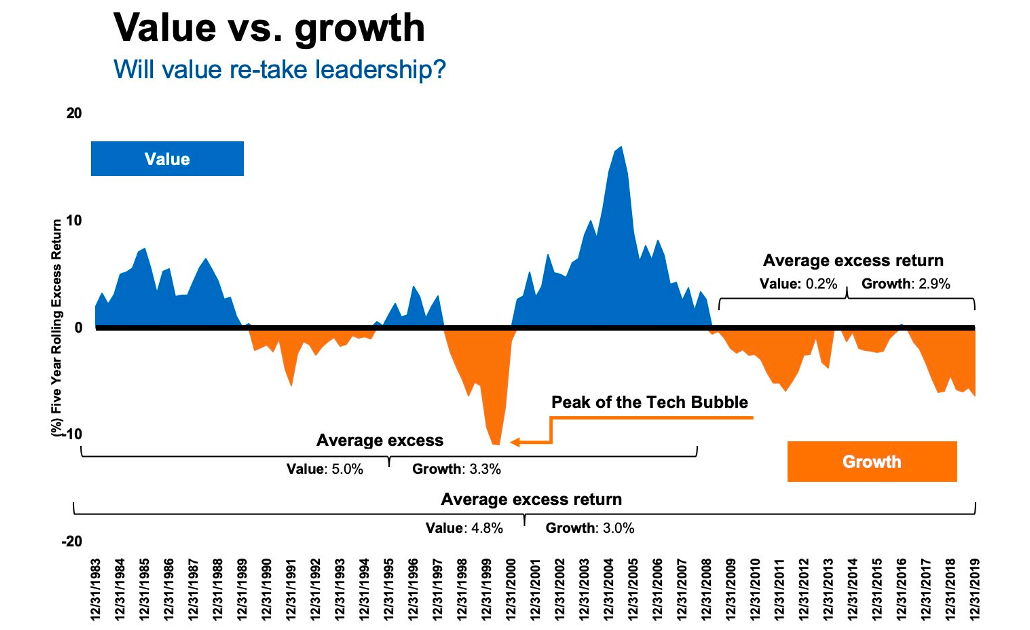 Growth-style investments have outpaced their value counterparts by a considerable margin since the Financial Crisis of 2008 and 2009. Propelled by an 11-year bull market from 2009 to 2020 and additional lift to tech stocks in a work-from-home environment, growth investing dominated value-oriented equities until just a few months ago. Now, the long-running trendline appears to be rolling over.