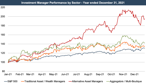 Our index of asset/wealth management aggregators also improved significantly during 2021, ending the year up nearly 40% driven by strong performance in the underlying businesses in which aggregators invest. Alternative asset managers led the way, however, with this index increasing nearly 90% during 2021 driven by strong net inflows due to increasing investor demand for alternative assets.