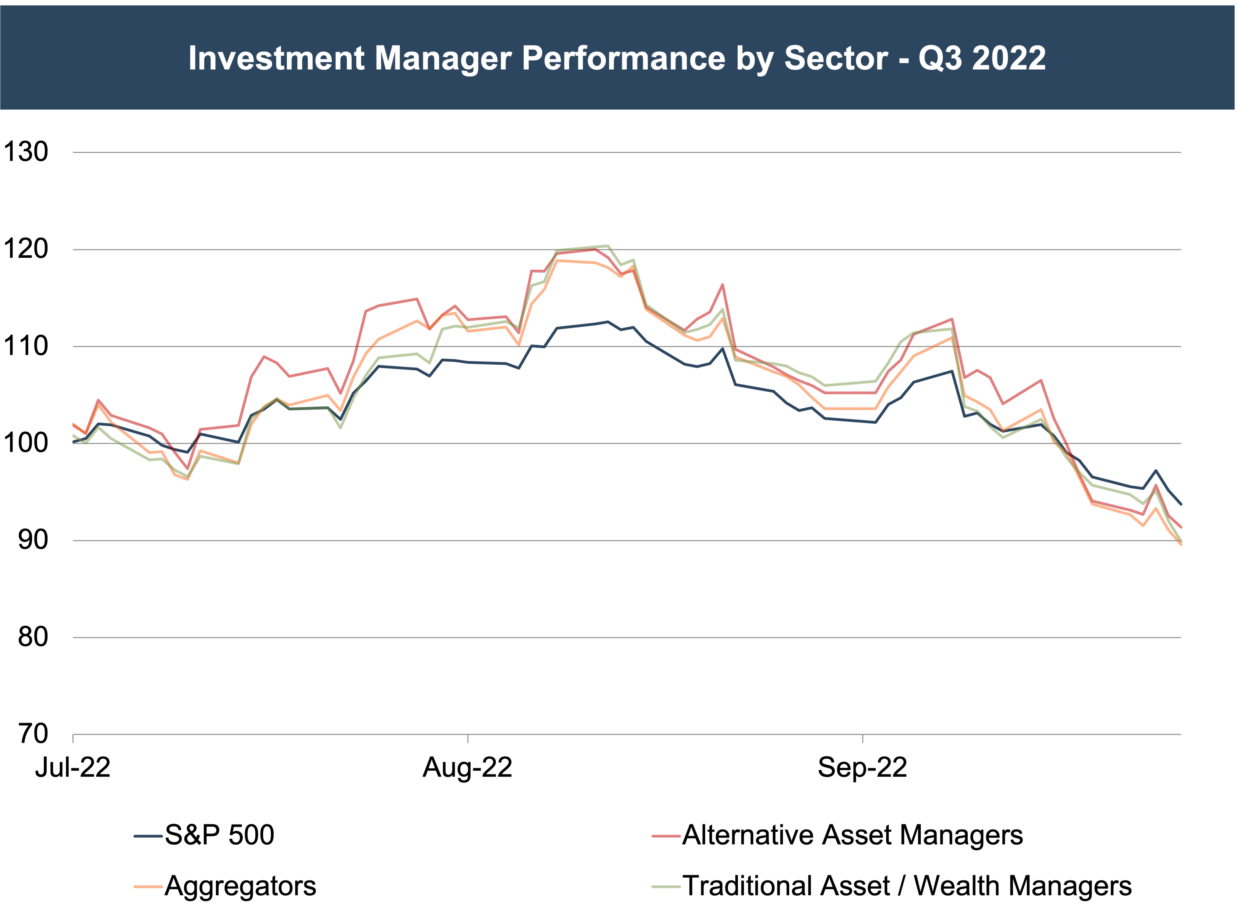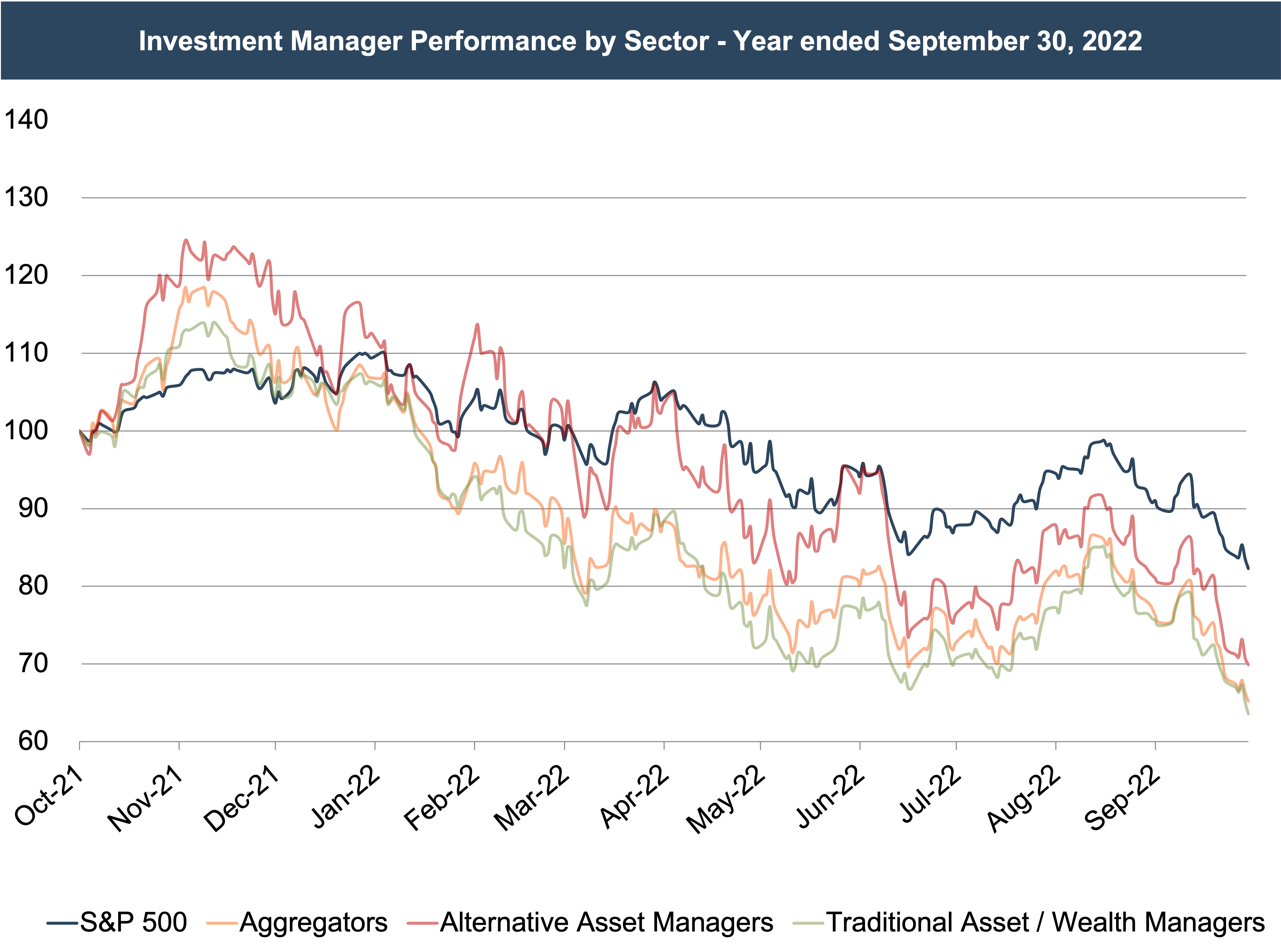 The market itself is part of the problem as this industry is mostly invested in stocks and bonds, which have been down considerably since the first of the year. The additional underperformance for asset and wealth managers is likely attributable to lower industry margins as AUM and revenue fall with the market while labor costs continue to rise. Rising interest rates have exacerbated this decline for alternative asset managers and RIA aggregators, who frequently employ leverage to make investments.