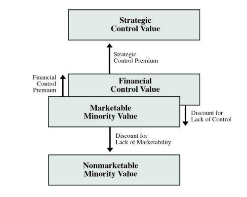 The general concept of the Levels of Value chart is the fair market value of equity securities corresponds to the public (or as-if-freely-traded) cost of capital (market risk, or beta), adjusted for idiosyncratic or non-systemic risks associated with a particular company (alpha). That exercise derives a valuation at the "marketable, minority" interest level of value (think public-share equivalent). Deviations from that anchor point are consequent from factors exogenous to the value of the enterprise. Some acquirers of controlling interests in a business might be able to pay more than the as-if-public price because of issues specific to them – usually operating synergies. Holders of minority interests in closely-held businesses might not be willing or able to pay as-if-freely-traded pricing because of the illiquidity inherent in the shares.