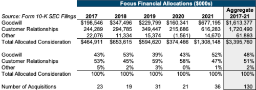 Due to their long-term nature, relatively low attrition rates, and importance as a driver of revenue in the asset and wealth management industries, customer relationships often command a relatively high portion of the allocated value. We can see this in the public filings of RIA aggregator Focus Financial. Between 2017 and 2021, Focus completed 130 acquisitions of RIAs. Of the aggregate allocated consideration for these transactions, a full 51% was allocated to customer relationships. Most of the remainder (48%) was allocated to goodwill.