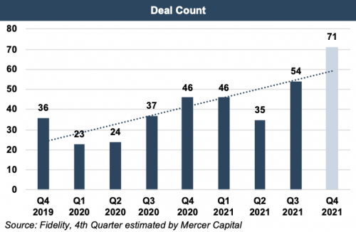 Deal count is projected to reach new highs in the fourth quarter of 2021 as market activity continues to gain momentum, likely rounding out another record-breaking year for the RIA industry.  In keeping with the rest of 2021, deal volume was driven by secular trends and supportive capital markets.  As market activity remains robust, competition for deals continues to favor RIA aggregators such as Mercer Advisors, Mariner Wealth Advisors, Wealth Enhancement Group, and Focus Financial Partners (FOCS), to name a few.