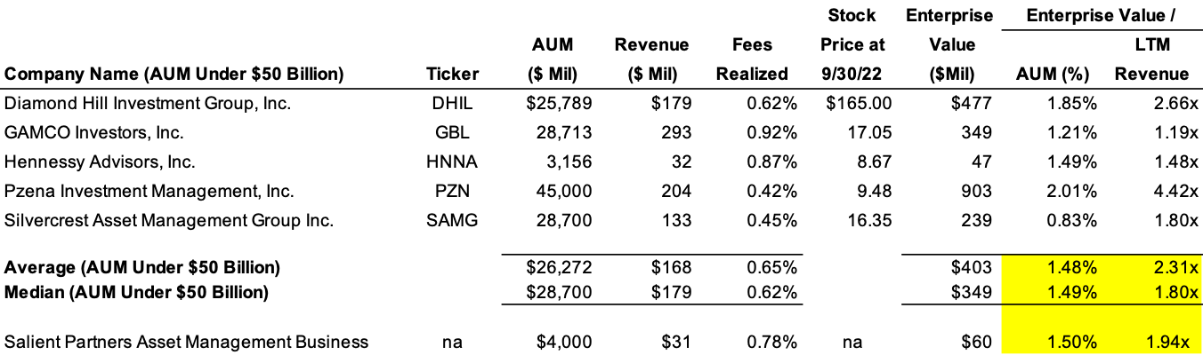 Two weeks ago, Westwood Holdings Group (ticker: WHG) completed its acquisition of Salient Partners’ asset management business.  The purchase price consisted of $35 million in cash at closing plus a potential $25 million in earn-out payments (in WHG stock and cash) contingent upon hitting specific revenue retention and growth rates over the next 2-3 years.  The deal is expected to add $4 billion in AUM and $31 million in annual revenue to WHG, pricing the total consideration (cash up front plus earn-out payments) at 1.5% of AUM and just under 2x revenue, which is right in line with WHG’s public peers.
