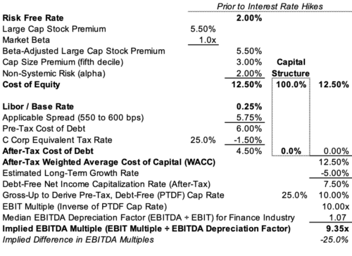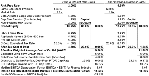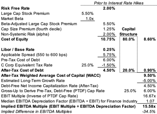 Last week we noted that RIA acquirers and aggregators now account for roughly half of the industry’s deal volume.  Since these firms are responsible for a significant portion of the sector’s acquisitions, changes in their cost of capital will affect how much they’re willing to pay for RIAs and the resulting multiple for many industry transactions.  In a rising interest rate (and cost of capital) environment, they’ll have to transact at lower prices to generate an ROI that justifies the investment.