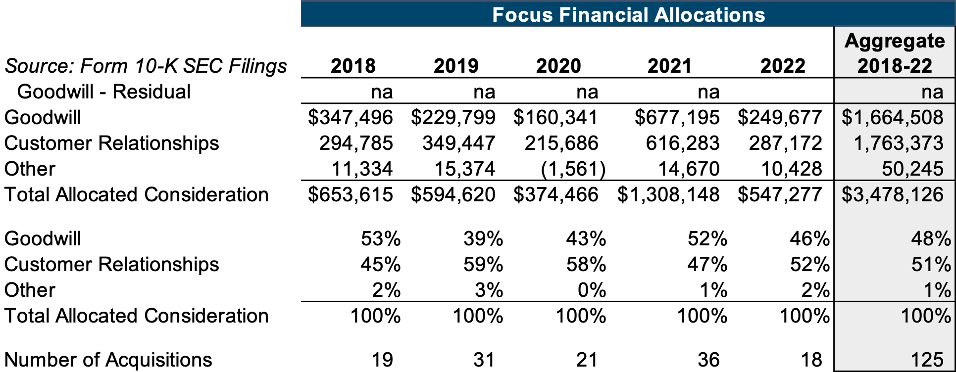 Due to their long-term nature, relatively low attrition rates, and importance as a driver of revenue in the asset and wealth management industries, customer relationships often command a relatively high portion of the allocated value. We can see this in the public filings of RIA aggregator Focus Financial. Between 2018 and 2022, Focus completed 125 acquisitions of RIAs. Of the aggregate allocated consideration for these transactions, a full 51% was allocated to customer relationships. Most of the remainder (48%) was allocated to goodwill.