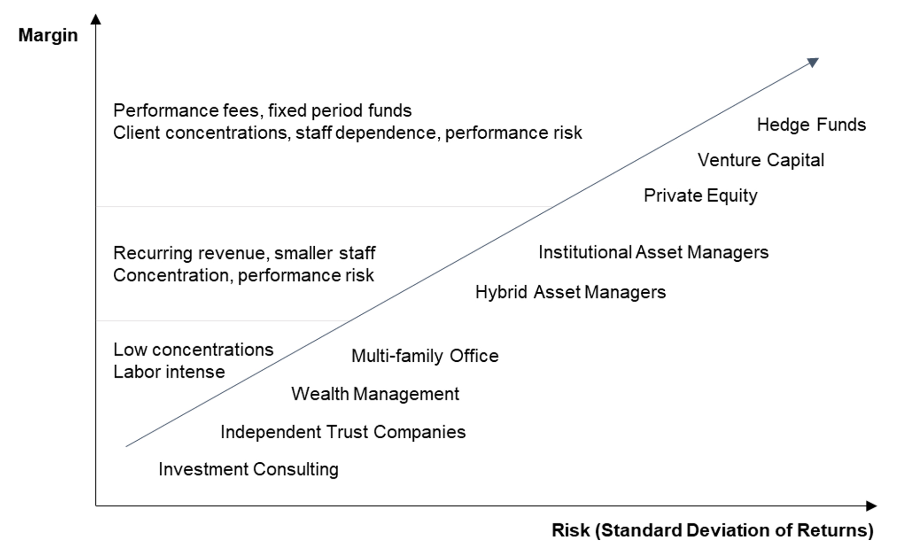 At the lower end of the spectrum are more labor-intensive disciplines like wealth management and independent trust companies. For these businesses, bringing on additional clients translates directly into increased workload for staff, which will ultimately translate into higher staffing levels and compensation expense as the business grows. While margins are lower, the risk is less. Key person risk is less, because an individual’s impact is generally limited to the clients they manage, and not the entire firm’s investment strategy. Client concentration is less, because wealth management firms tend to have a large number of HNW clients rather than a few large institutional clients. Individual clients tend to be stickier than institutional clients, and performance risk is generally less of a concern as well.