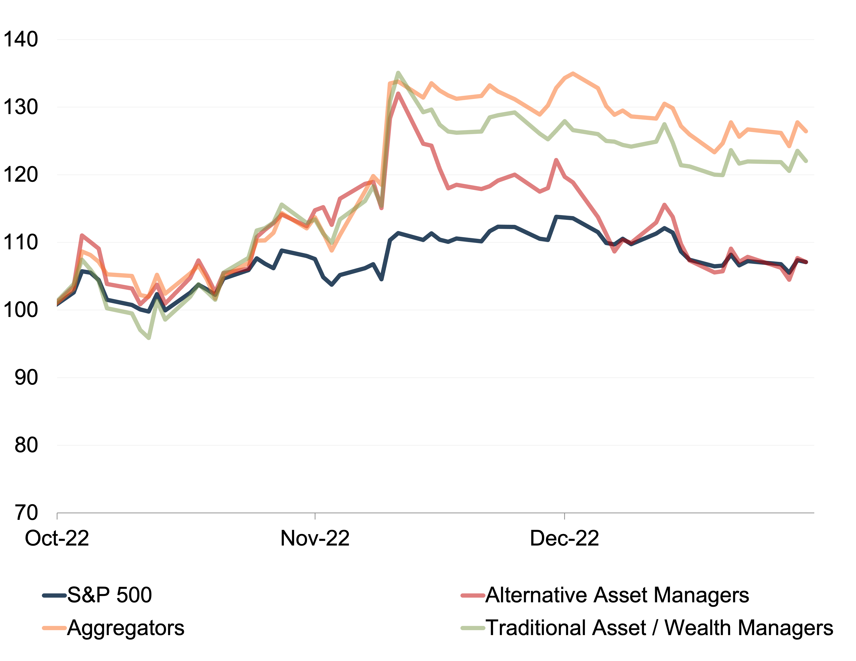 The RIA industry saw a strong fourth-quarter rally, driving most categories of publicly traded investment managers to outperform the S&P in the last quarter of the year. Alternative asset managers, however, declined from their early-November peak to perform in line with the S&P during this period.