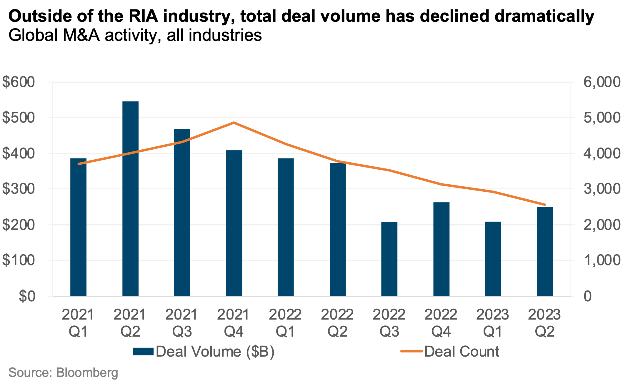 A year ago, our (quite natural) prediction was that a higher cost of capital for RIA aggregators would lead to a slowdown in deal activity. Such a prediction would have been resoundingly validated in virtually any other industry. Outside of the RIA industry, buyers have pumped the brakes, and deal activity has plummeted: