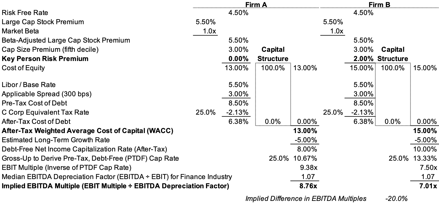 It is more common for us to be involved in scenarios where the RIA has a dependency on a certain partner (or partners) for client relationships, firm management, investing acumen, or business development, and this phenomenon is known as key person risk.  In this instance, none of the partners are threatening to leave the firm, but there remains the possibility that one or more of them could do so, and the business would be devoid of their contributions to revenue and overall firm management. In the example below, we examine the impact of key person risk on a firm’s cost of capital and valuation multiple.  Firm A, in this instance, has clients served by a team of advisors with firm management and business development responsibilities shared by a group of senior employees, while Firm B is dependent on a couple of key individuals for a substantial portion of the firm’s revenue and managerial duties.