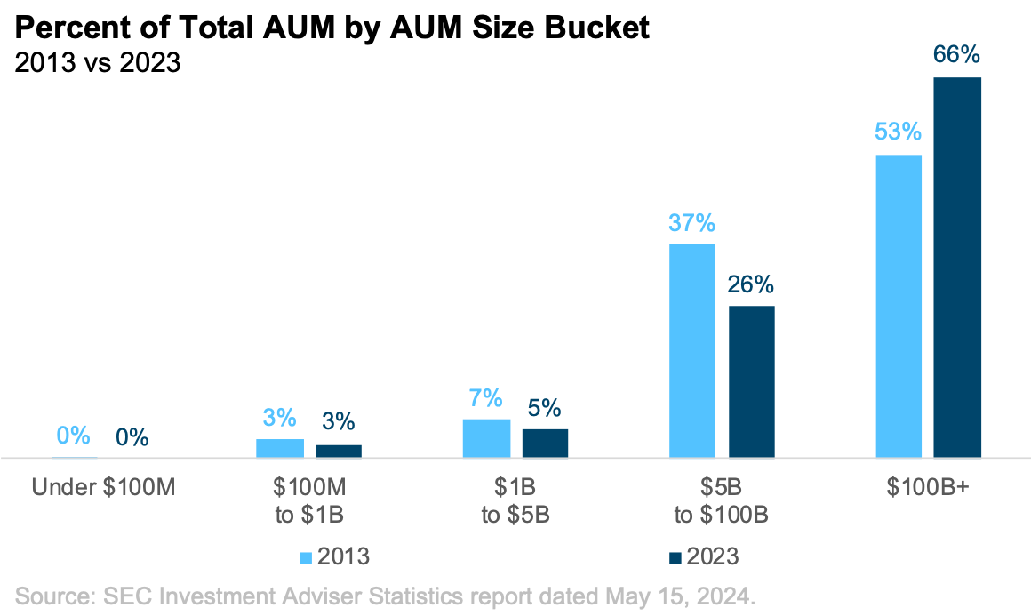 These wrinkles aside, the data is unambiguous in that there are more SEC-registered advisory firms today than ever before—and that’s hardly indicative of an industry in the throes of consolidation. Another way to track consolidation is to look at how assets under management are distributed across firms of different sizes rather than at the number of firms.