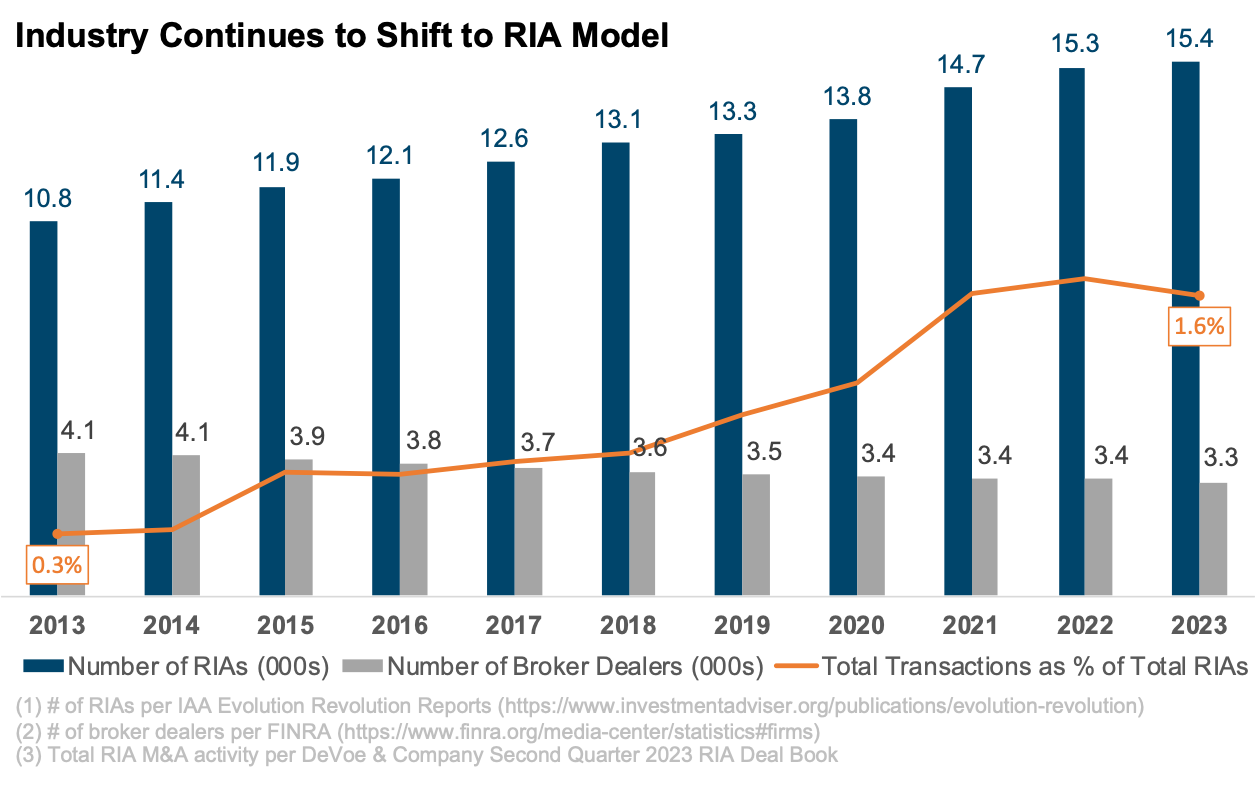 This overarching shift from the broker-dealer model to the RIA model is multi-faceted. For one, it’s clear that clients (in general) prefer the advisory relationship offered by RIAs over that offered by their broker-dealer counterparts. And a model that’s in demand by clients is also in demand by advisors. Additionally, we’ve found that building significant enterprise value (value attributable to the business, not the individual) is generally easier for firm owners to achieve under the RIA revenue model than the broker-dealer model. This prospect of building a business with enduring value that can be sold to an external buyer at the end of the founder’s career or transitioned to next-generation management is a key motivation behind many advisors’ decisions to start their own RIA. It also doesn’t hurt that, compared to the broker-dealer model, the capital required to start an RIA is relatively minimal.