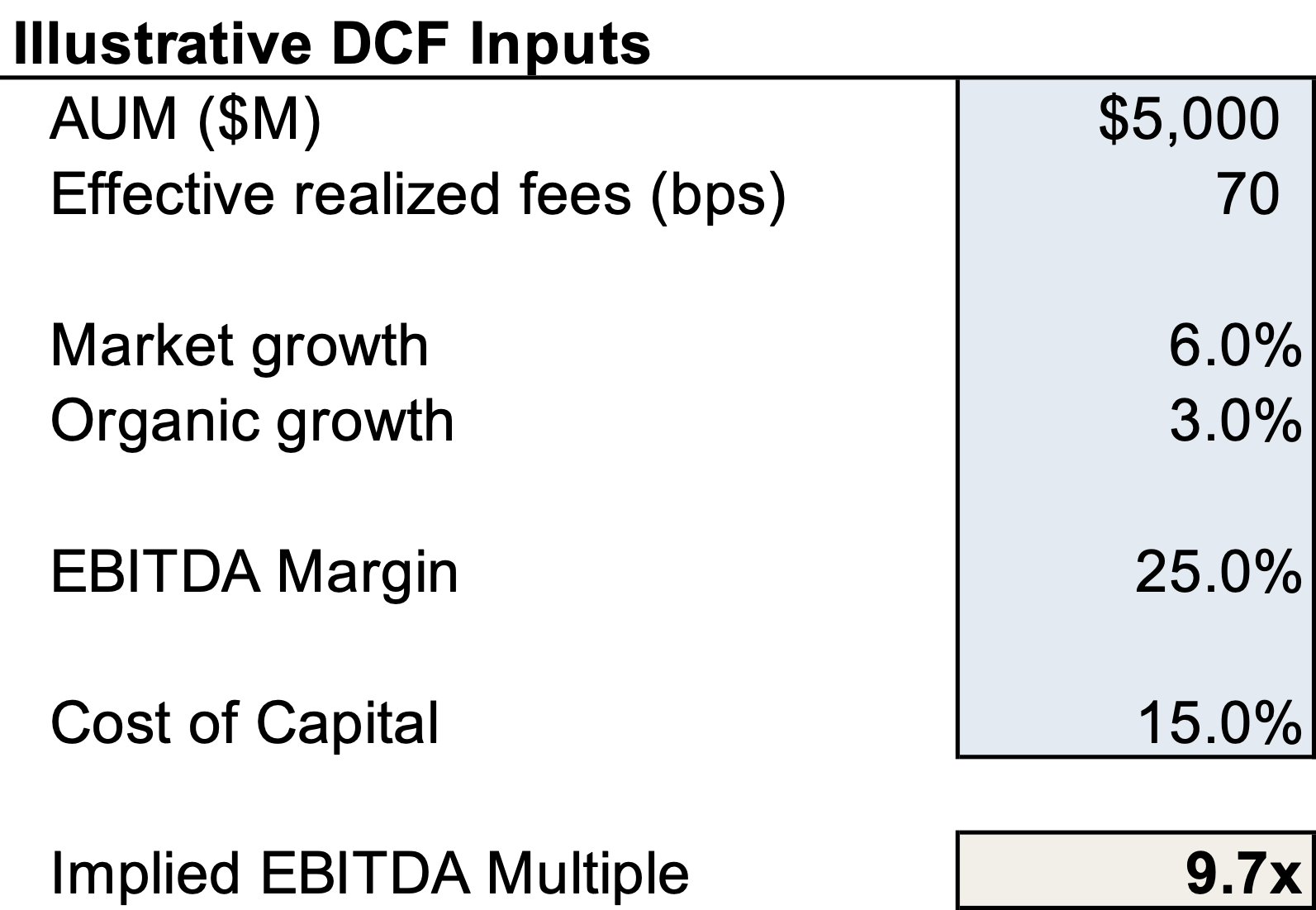 How do these disparities in organic growth impact firm valuations? To illustrate, consider the following simplified discounted cash flow model. A hypothetical firm managing $5 billion in assets earns realized fees of 70 basis points and generates a 25% EBITDA margin. Over a 10-year discrete forecast period, market growth is assumed to contribute 6% annually to AUM growth, and net organic growth is assumed to contribute 3% annually—or roughly the industry average excluding the high performers. At a 15% cost of capital, the implied EBITDA multiple is 9.7x.