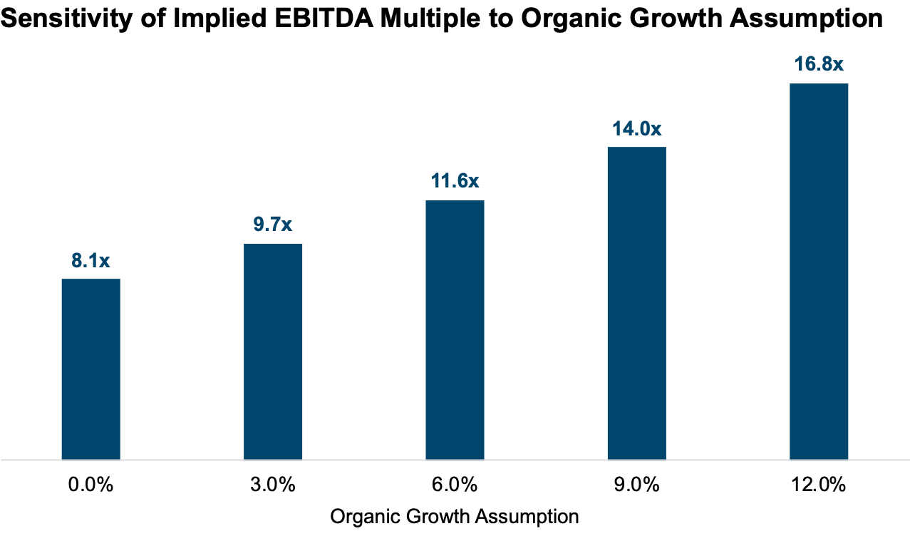 What happens as we vary the net organic growth assumption? The chart below shows the sensitivity of the implied EBITDA multiple to different net organic growth assumptions. Holding the other assumptions constant, each percentage point of organic growth contributes to about a 0.5x to 1.0x increase in the EBITDA multiple. The result is that a firm growing at 12% organically would (in theory) command an EBITDA multiple of more than double that of a firm without any organic growth.