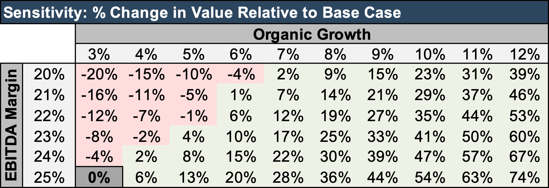The sensitivity table below shows the change in value relative to a base case assuming a 25% EBITDA margin and 3% organic growth. What we see is that, generally speaking, a one percent decline in the EBITDA margin coupled with a one percent increase in organic growth is marginally accretive from a valuation perspective. If the ratio of organic growth gained to EBITDA margin sacrificed is greater than 1:1, the impact on valuation is even more accretive. The takeaway is that in the tradeoff between margin and growth, growth usually wins.