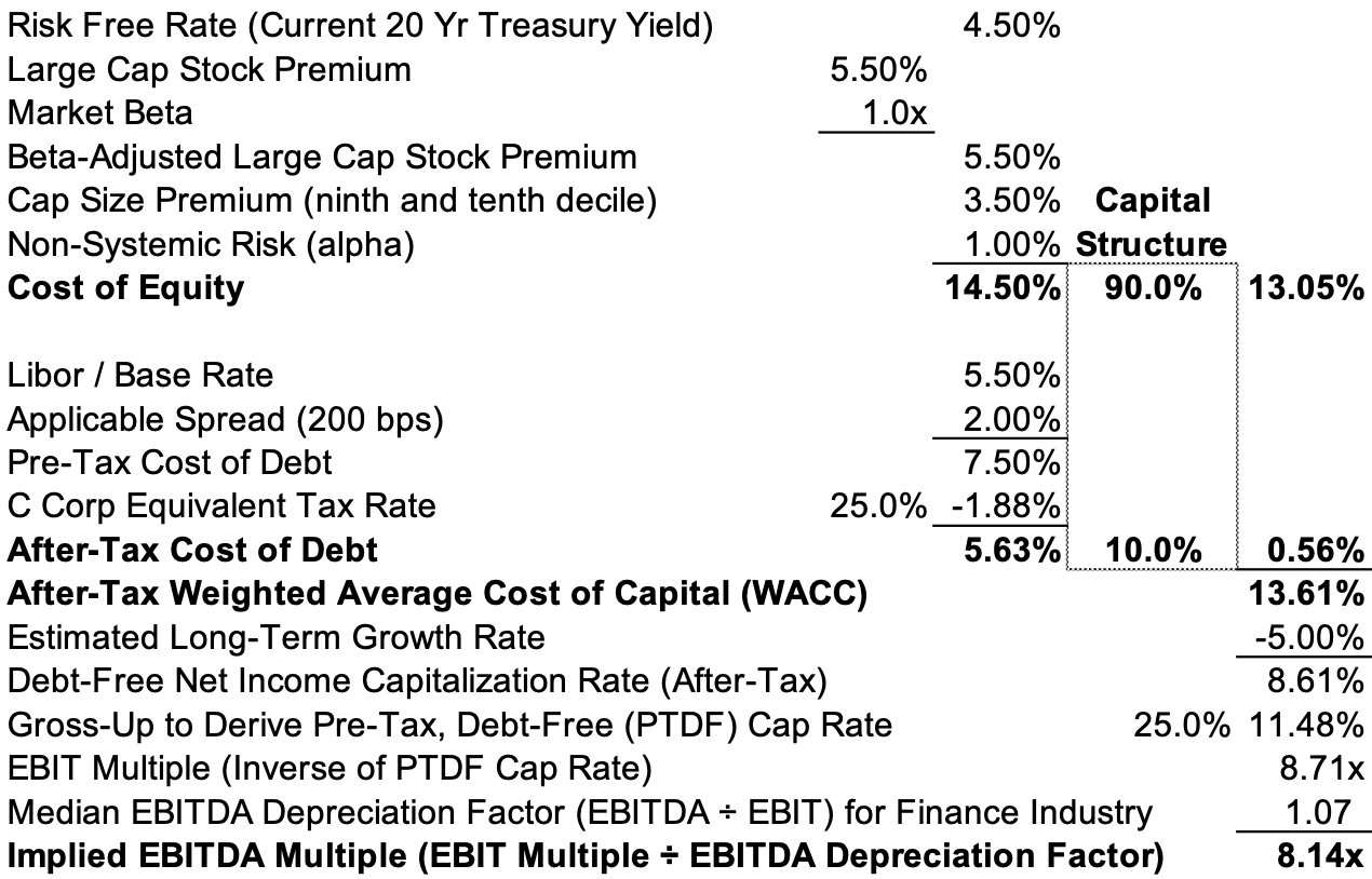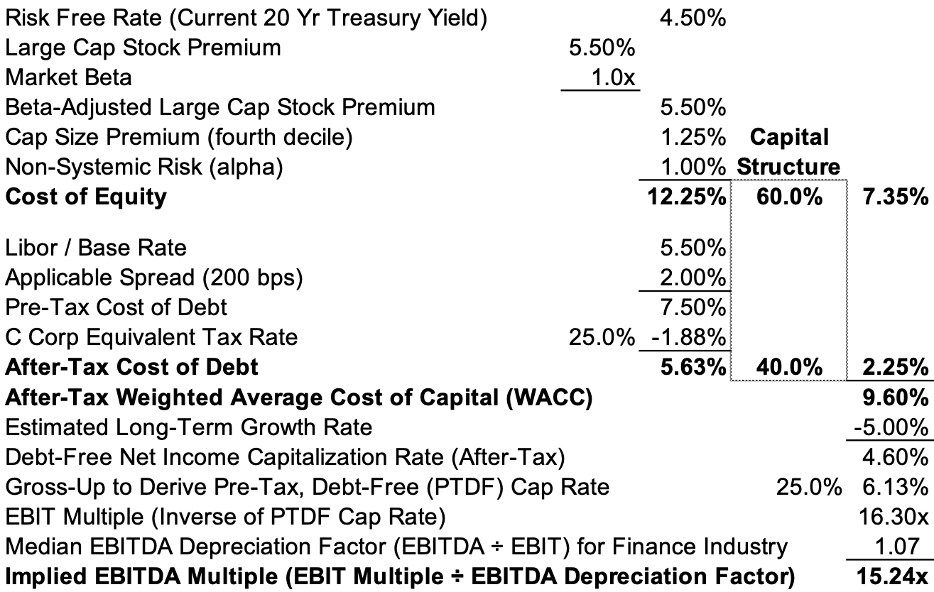 This analysis suggests that an RIA aggregator’s cost of capital and growth profile support a 15x EBITDA multiple.  There’s also market evidence to affirm these valuations — Goldman is estimated to have paid ~18x EBITDA for RIA aggregator United Capital, and PE firm Clayton, Dubilier & Rice purchased Focus Financial for ~13x EBITDA last year.