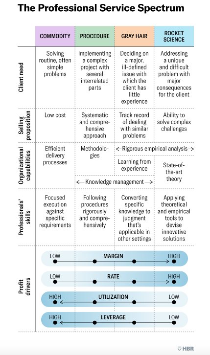 The framework categorizes firms into four buckets based on where they fall along a spectrum of the complexity of services provided. At one end of the spectrum are Commodity Practices—firms that offer undifferentiated services that solve simple problems. Next are Procedural Practices—those firms that offer clients the ability to tackle larger problems that are complicated primarily by larger scope and multiple moving parts. Next are Gray Hair Practices—firms that bring experience and institutional knowledge to solve even more complex problems. At the other end are Rocket Science Practices—firms that solve unique, difficult, and high-stakes problems for sophisticated clients.
