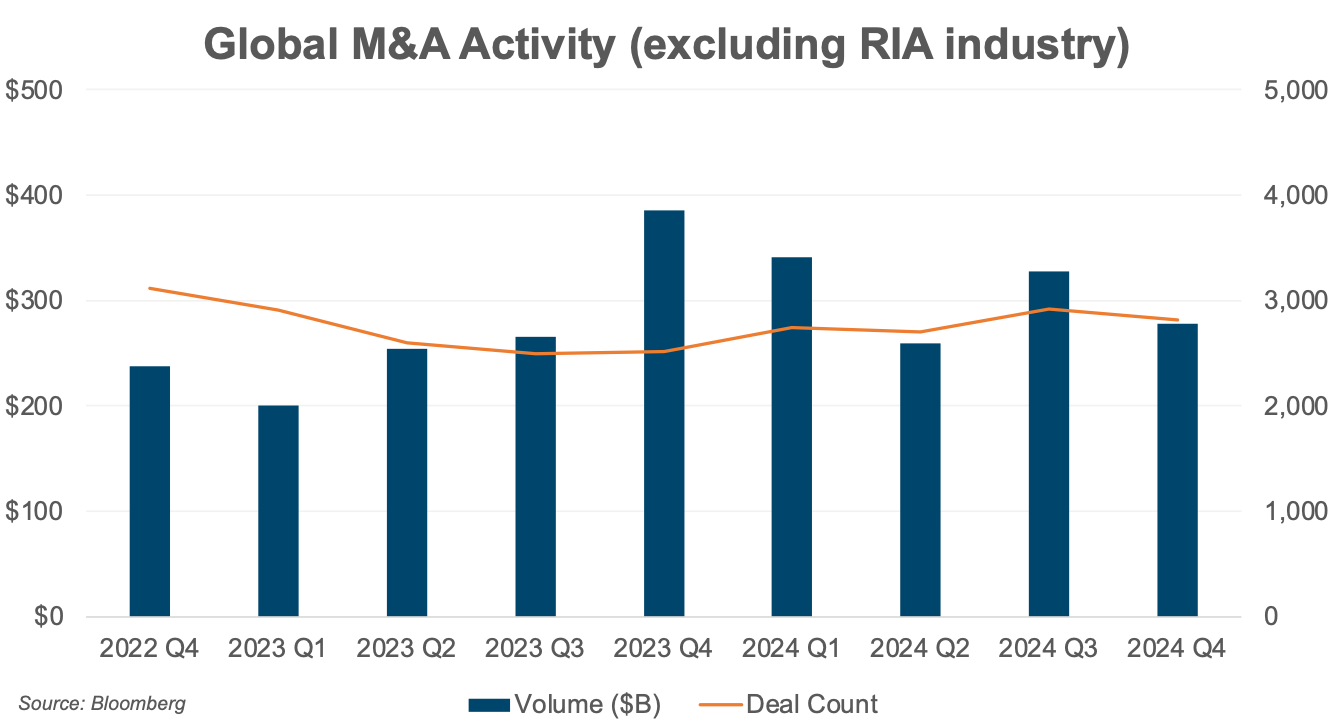Despite the resurgence in RIA transactions in the fourth quarter, the industry’s overall deal activity still lags behind the broader M&A market. The number of M&A transactions for all industries (excluding the RIA industry) increased by 6% year-over-year (per Bloomberg), compared to the M&A activity in the RIA industry, which remained flat over the same period.