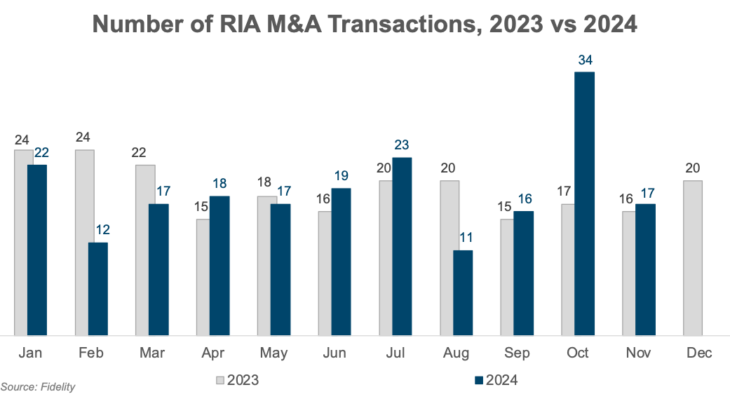 M&A activity in the RIA industry, which had been trailing 2023 levels for much of 2024, experienced a dramatic surge in October. This spike set a new record for monthly deal volume and brought year-to-date transaction figures through November in line with 2023’s pace. Fidelity’s November 2024 Wealth Management M&A Transaction Report listed 206 deals through November, which approximates the 207 deals executed during the same period in 2023.