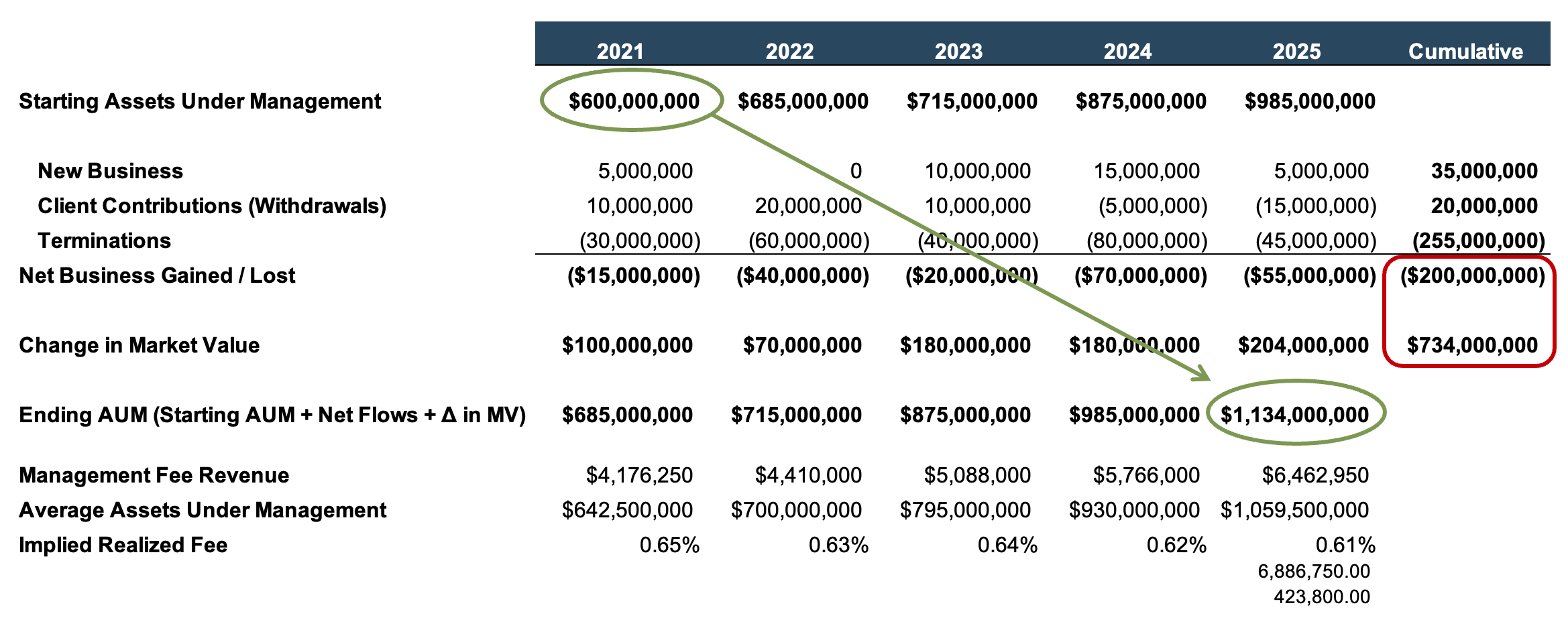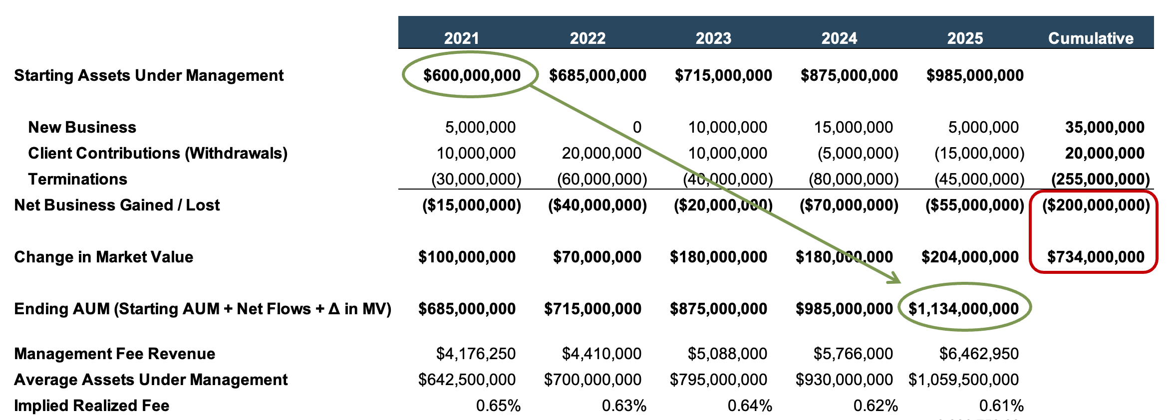 Looks great, until you notice $700 million in market gains hid a $250 million organic outflow (just $35 million new vs. $285 million terminations), yet netted $500 million growth. Skip the details, and you're celebrating your wins while you’re veering off the road.