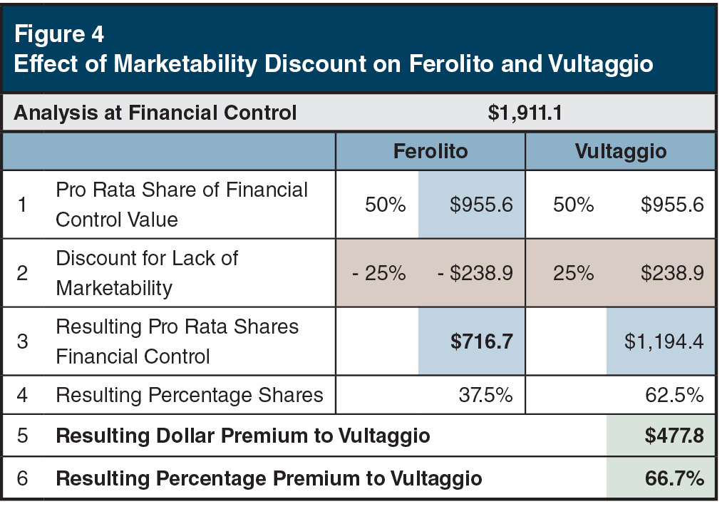 The result of the imposition of a 25% marketability discount is to transfer $478 million of value to the Vultaggio column, resulting in a 66.7% premium in value for Vultaggio. In other words, the imposition of the marketability discount at the enterprise level ($478 million) resulted in a shift in value of that entire amount to Vultaggio's 50% interest.