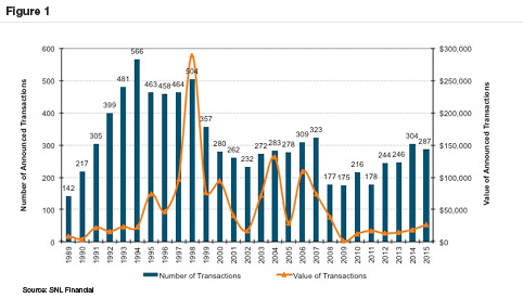 Statistics can be deceptive. The bank M&A market in 2015 could be described as steady, bereft of any blockbuster deals. According to SNL Financial 287 depositories (253 commercial banks and 34 thrifts) agreed to be acquired in 2015 compared to 304 in 2014 and 246 in 2013. Since 1990, the peak in M&A transactions occurred in 1994 (566) followed by 1998 (504). For those who do not remember, 1998 was the blockbuster year when NationsBank/Bank of America, Norwest/Wells Fargo, Bank One/First Chicago NBD and SunTrust Banks/Crestar Financial among others agreed to merge (Figure 1).