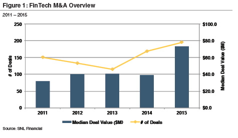 - FinTech M&A volume and pricing rose sharply over recent historical periods with 195 announced deals and a median deal value of $74 million in 2015 (Figure 1);