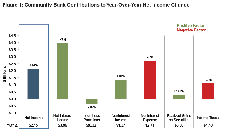 As detailed in Figure 1, key contributors to improving earnings were higher net interest income and lower loan loss provisions. Loan growth drove the improvement in net interest income as 84% of community banks reported loan growth in the trailing twelve month period, with the median community bank’s loan growth rate reported at 7.2%. Loan growth offset net interest margin (“NIM”) compression as NIMs were at their lowest level over the 10-year historical period. As the Federal Reserve’s zero-interest rate policy (“ZIRP”) grinds on, asset yields continue to compress while funding costs have essentially reached a floor. One interesting item to gauge in future quarters is how much interest rate and credit risk is being taken by community banks to grow loans and earnings.