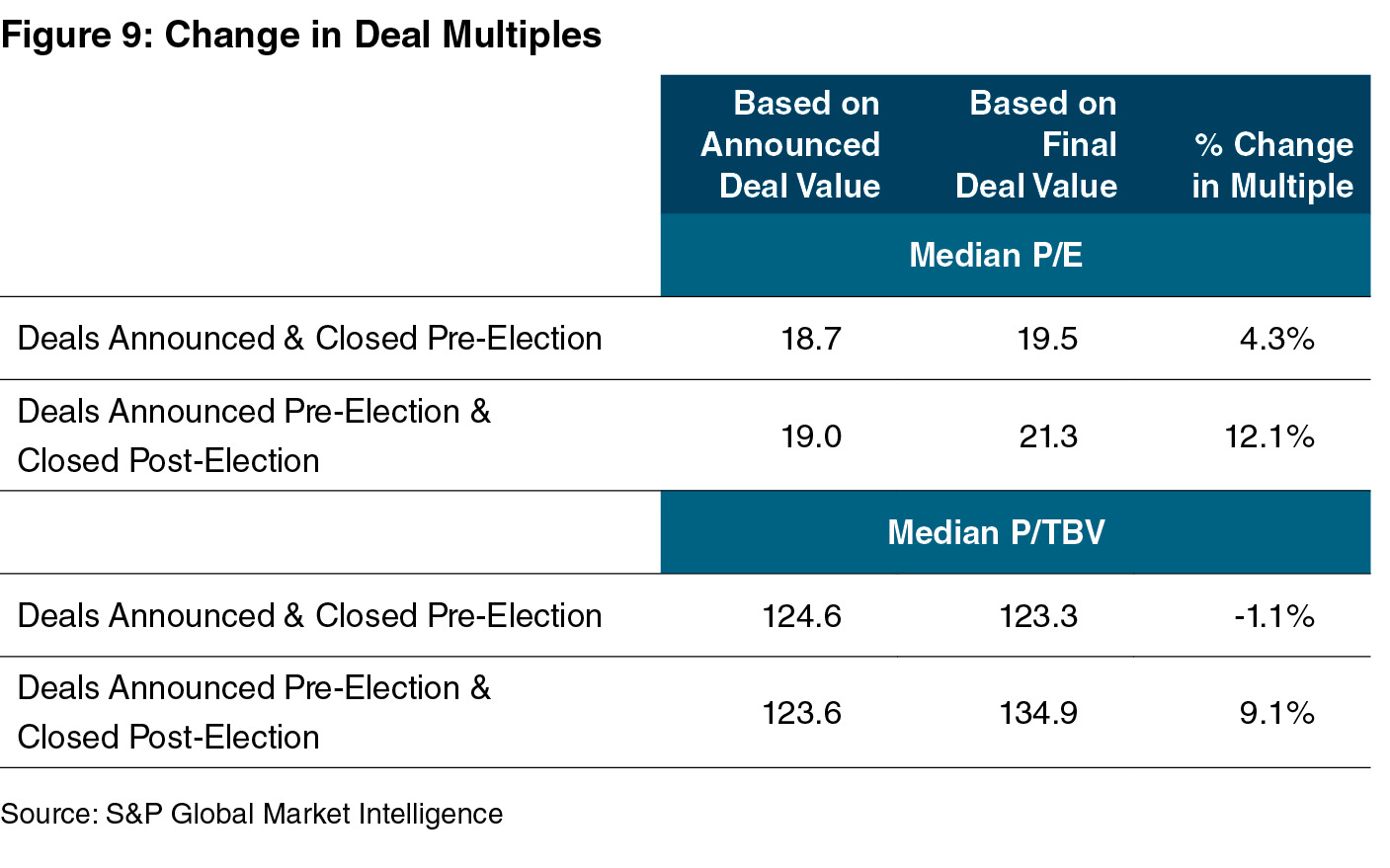 Figure 9 shows the change in deal multiples from announcement to closing and compares the change between deals announced and closed pre-election to those closed post-election. With the run-up in pricing, P/E and P/TBV multiples increased 12% and 9% from announcement to close compared to 4% and a decline of 1% pre-election.