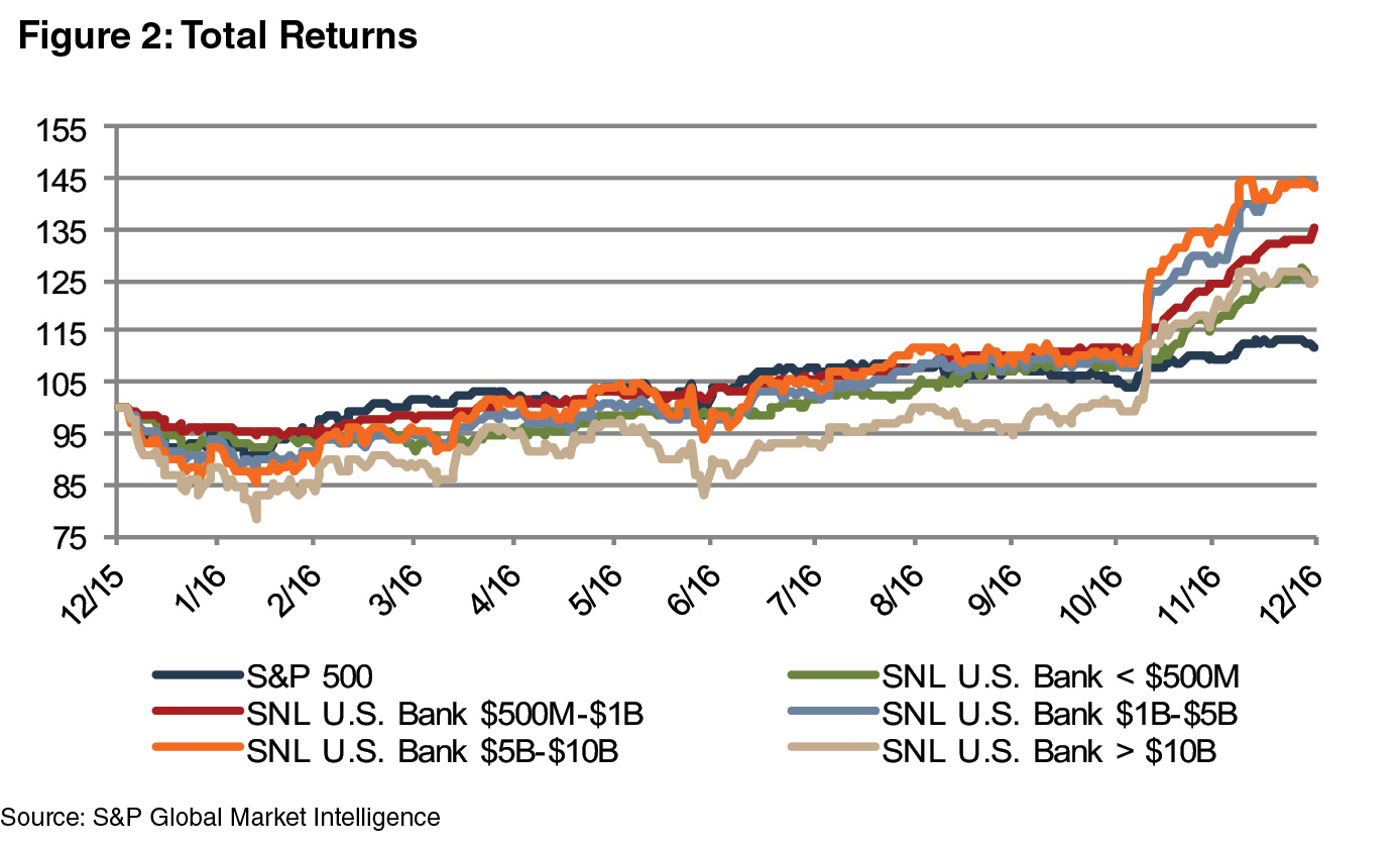 Not surprisingly, the heavily regulated financial sector outperformed the broader market, with bank stocks (as represented by the SNL U.S. Bank Index) gaining 23% versus 5% for the S&P from November 8th through the end of the year. Most of the return for the bank index was realized after the election given the full year total return of 26%. Banks in the $1 to $5 billion and $5 to $10 billion groups led the way in 2016 with total returns on the order of 44% for the year.
