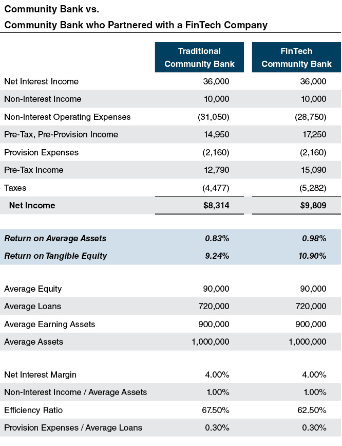 While each option presents a unique set of considerations and execution issues/risks, a detailed analysis, including an IRR analysis, helps a bank determine the financial impact of each strategic decision and informs the optimal course. A detailed analysis also allows the bank to compare its FinTech strategy to the bank’s more traditional growth strategies, strategic plan, and cost of capital. See the table to the right for an example of a traditional community bank compared to a bank who has partnered with a FinTech company.