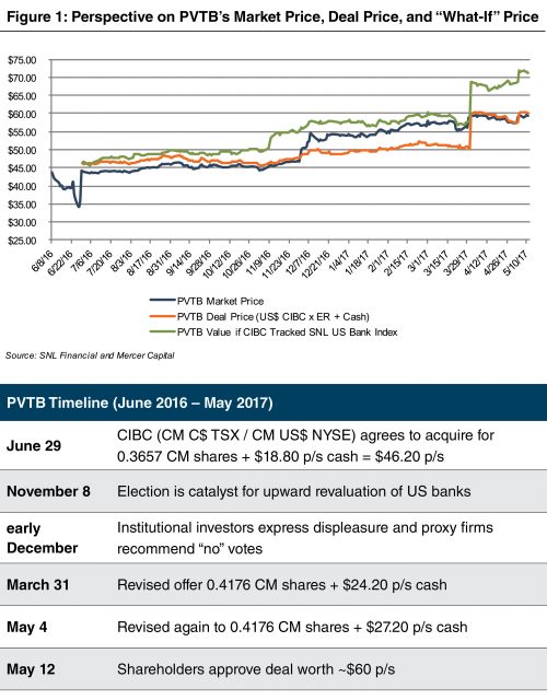 CIBC subsequently upped the consideration two times. On March 31, 2017, it proposed to acquire PVTB for 0.4176 CIBC shares and $24.20 per share of cash. On May 4, CIBC further increased the cash consideration by $3.00 to $27.20 per share because its shares had trended lower since March as concerns intensified about the health of Canada’s housing market. On May 12, shareholders representing 66% of PVTB’s shares approved the acquisition.