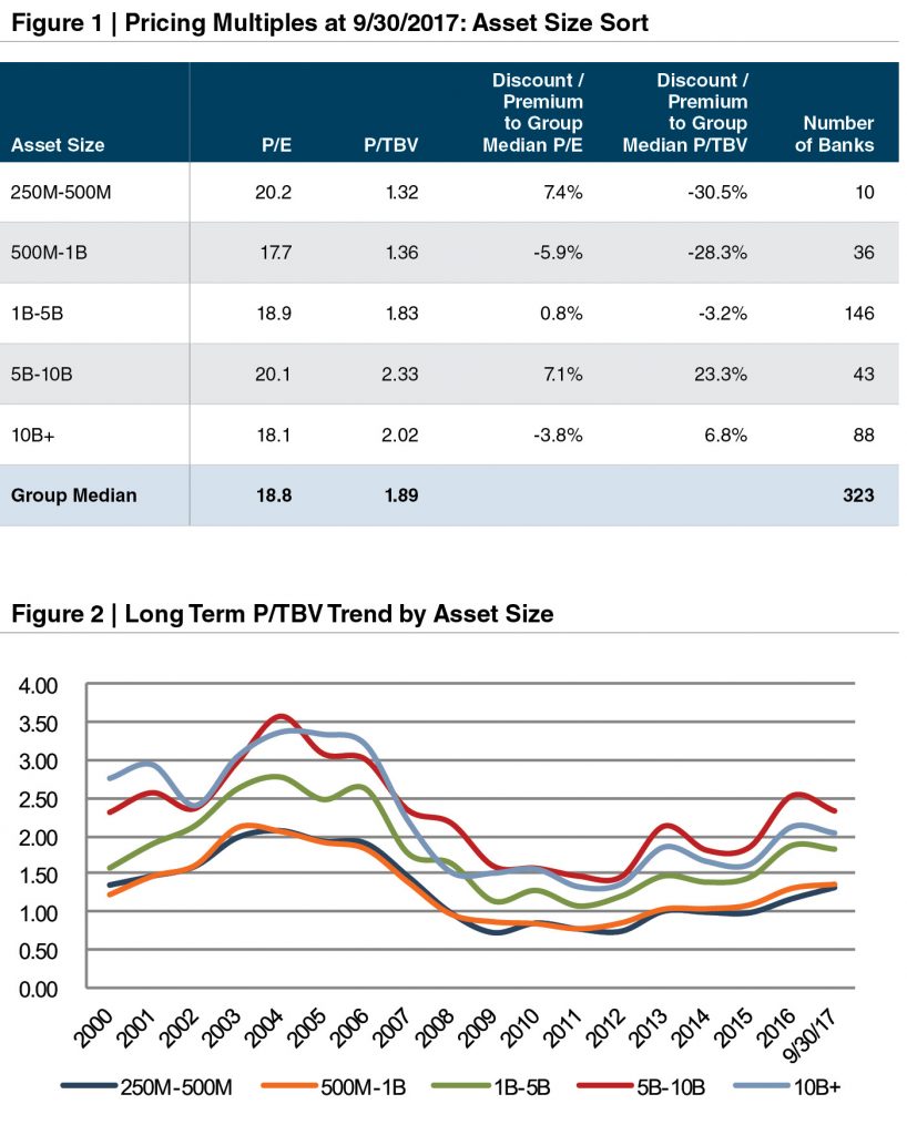 Size differentials generally encompass a range of underlying considerations regarding financial and market diversity. A larger asset base generally implies a broader economic reach and oftentimes a more diverse revenue stream which can help to mitigate harmful effects of unforeseen events that may adversely affect a certain geographic market or industry. Furthermore, larger banks tend to have access to more metropolitan markets which have better growth prospects relative to more rural markets. Figures 1 and 2 on the next page illustrate that, to a point, larger size typically plays a role in value, as measured by price / tangible book value multiples. The sweet spot for asset size seems to be between $5 and $10 billion in total assets. Banks in this category traded at the highest P/TBV multiple as of September 30, 2017 and have generally outperformed all other asset size groups over the long term.