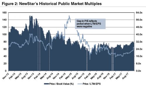 While the P/TBV multiple for the transaction is modest, the P/E multiple is not at 26.5x (the latest twelve month (“LTM”) earnings) and 18.4x (the consensus 2018 estimate). The P/E could be described as full if NewStar were an average performing commercial bank and very full if it was a typical commercial finance company in which low teen P/Es are not unreasonable.