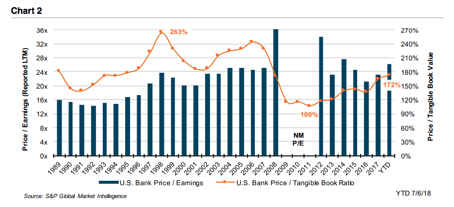 Pricing has trended higher as measured by the average price/tangible book value (P/TBV) multiple, which increased to 172% in 2018 from 164% in 2017 and about 140% in 2014-2016 before the sector was revalued after the national election on November 8, 2016.