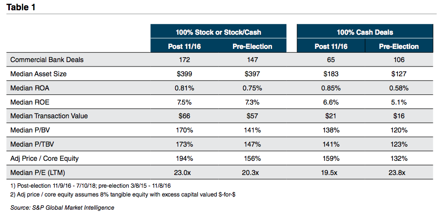 The improvement in public market multiples has supported expansion of M&A multiples when the majority of the consideration consists of the buyer’s common shares. As shown in Table 1, the median P/TBV and P/E ratios for transactions announced in the 20 months since the election were 173% and 23.0x compared to 147% and 20.3x for the 20 months ended November 8, 2016. Multiple expansion is even more pronounced when only 2018 deals are considered because the YTD median P/TBV and P/E multiples are 193% and 25.4x.
